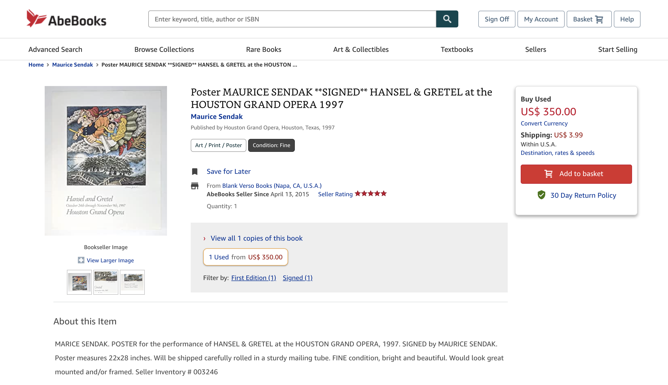 Maurice Sendak AbeBooks listing accessed September 24, 2022