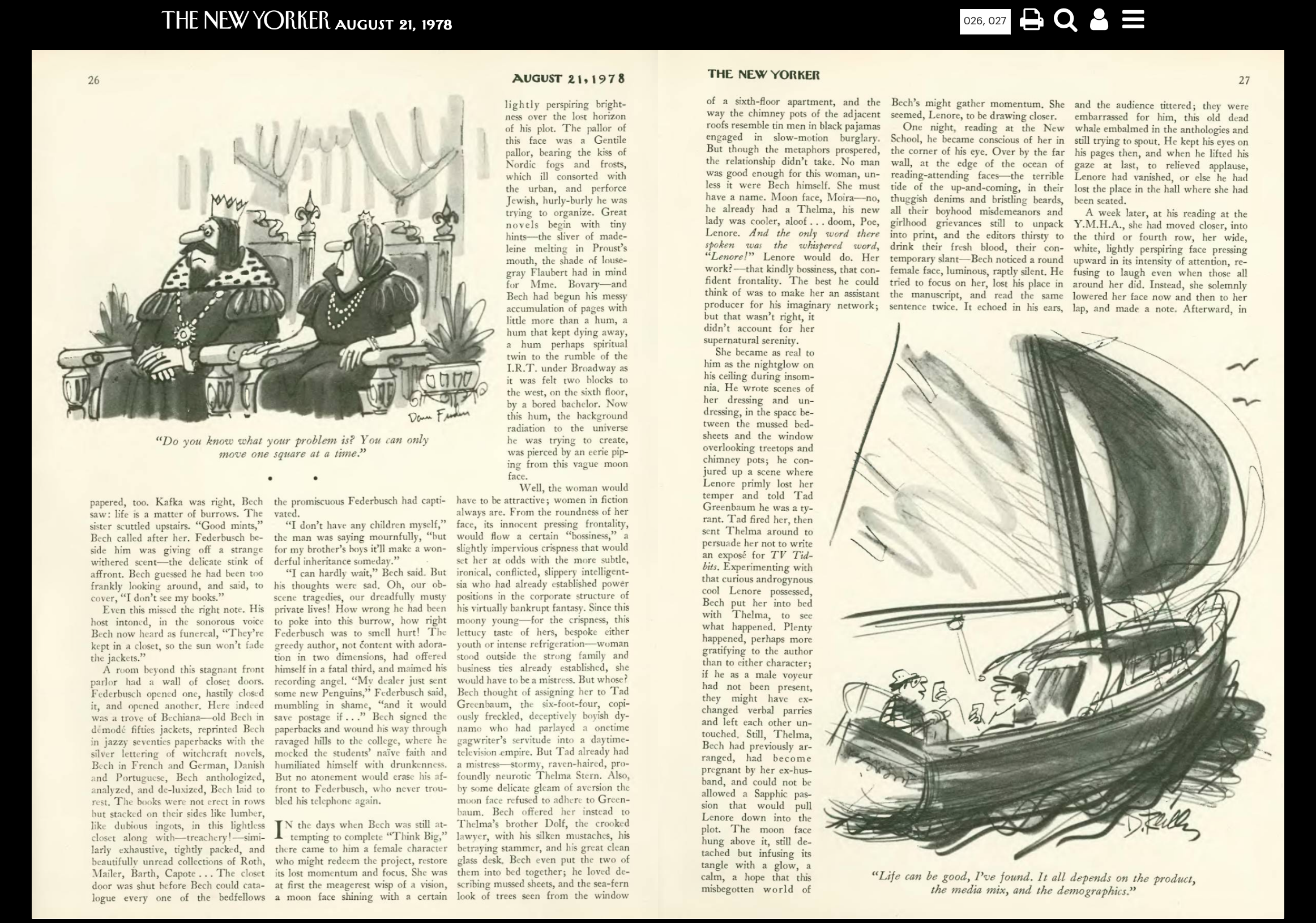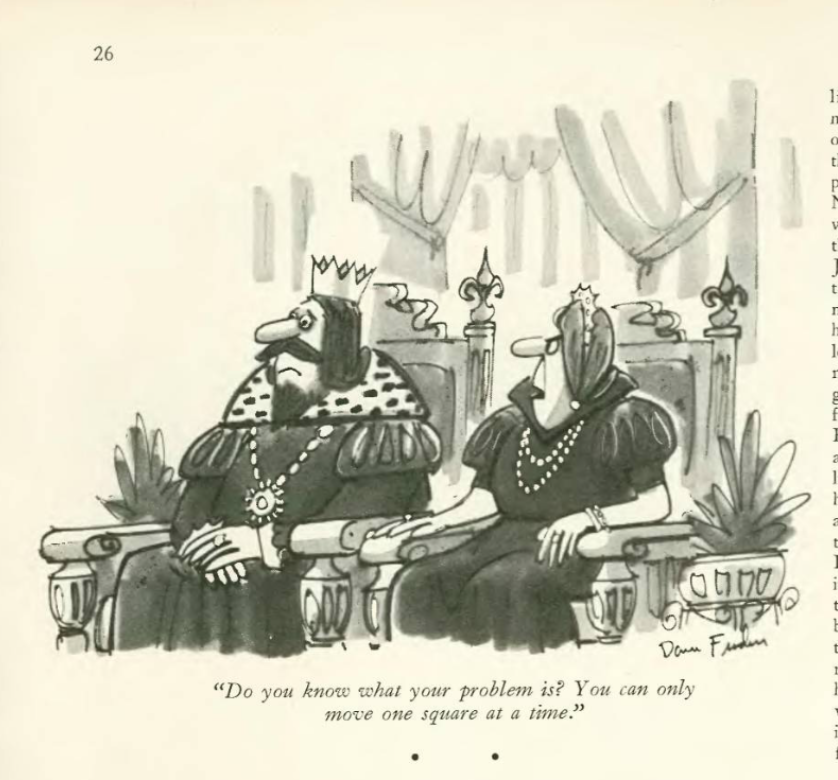 "Do you know what your problem is? You can only move one square at a time." Dana Fradon The New Yorker, August 21, 1978, p. 26 |