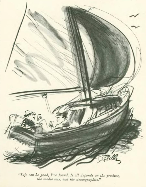 | "Life can be good, I've found. It all depends on the product, the media mix, and the demographics." Donald Reilly The New Yorker, August 21, 1978, p. 27 |